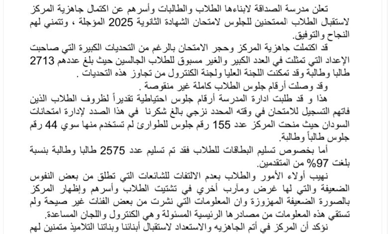 وجددت الإدارة تأكيدها على جاهزية المركز الكاملة، مشيرة إلى حرصها على تهيئة كافة الظروف لضمان سير الامتحانات بسلاسة، متمنية التوفيق والنجاح لجميع الطلاب.