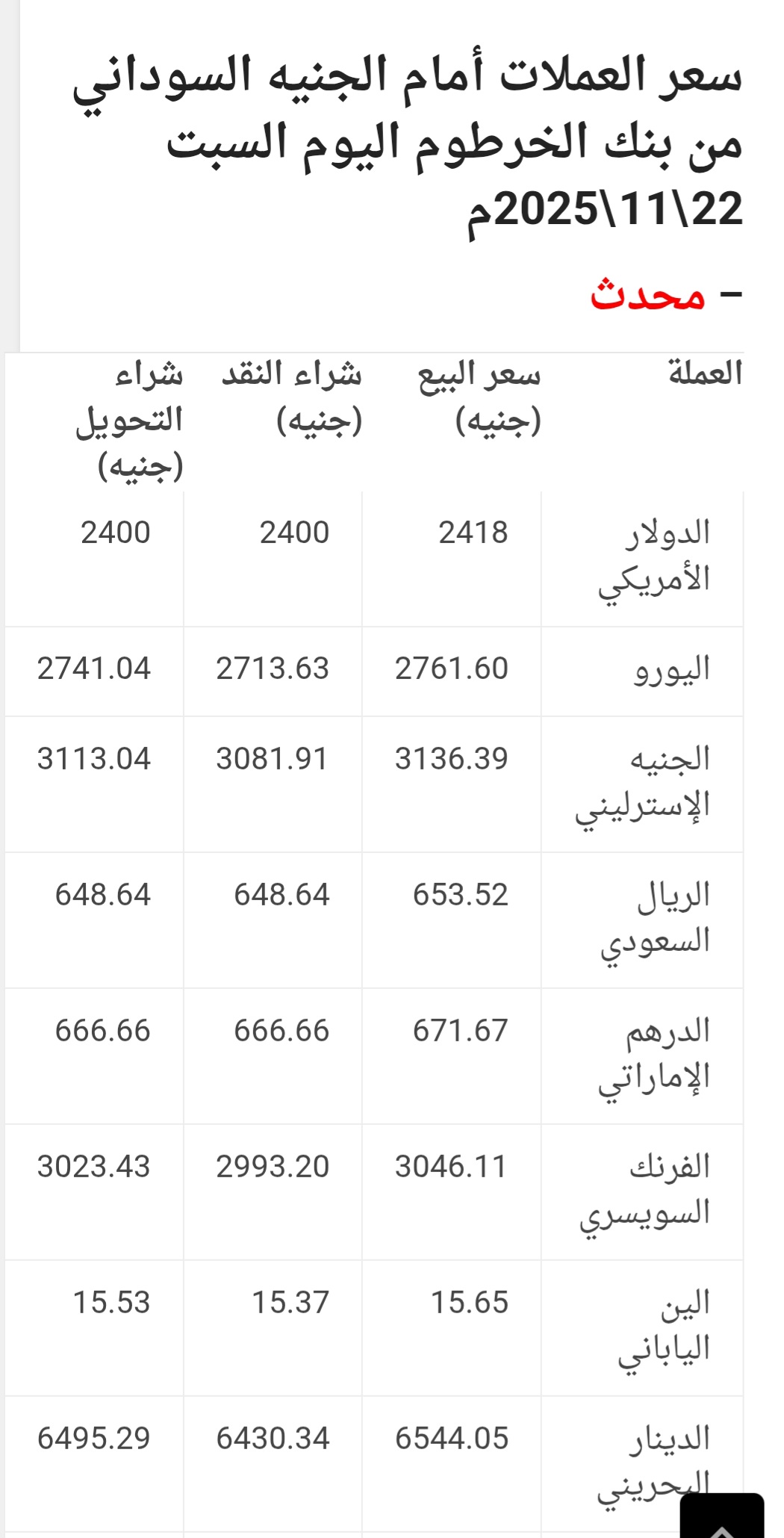 وحسب متداولون للعملات في السوق الموازي أن أسعار بيع العملات مقابل الجنيه السوداني اليوم السبت 22\11\2025م