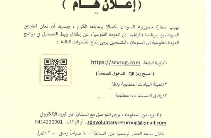 تهيب سفارة جمهورية السودان بدولة أوغندا، للاجئين السودانيين بيوغندا والراغبين في العودة الطوعية، عن إطلاق رابط التسجيل في برنامج العودة الطوعية إلى السودان ، للتسجيل يرجى إتباع الخطوات التالية :