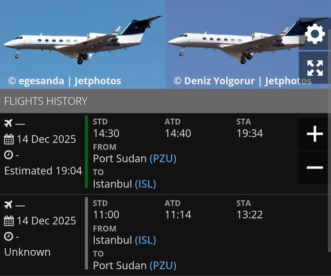 هبطت في مطار مدينة بورتسودان طائرة خاصة تركية من طراز غلف ستريم IV تحمل رقم التسجيل TC-IHA وتشغلها شركة CKD Havacılık المرتبطة بجهاز المخابرات التركي (MIT)،